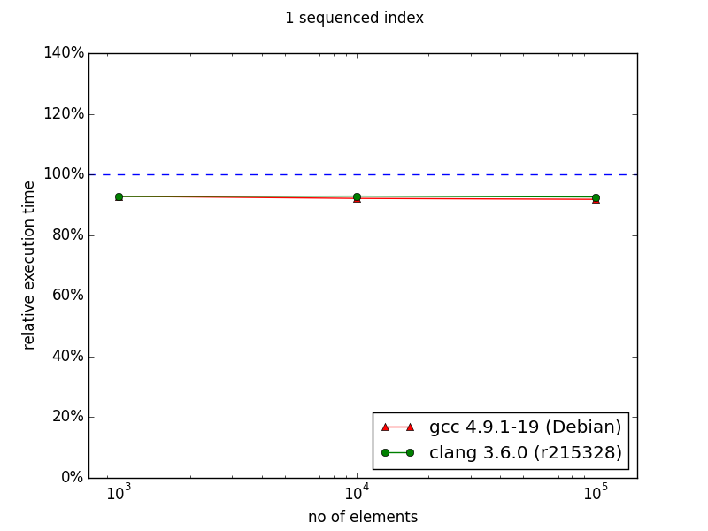 In case of two indexes - one indexed and the second sequenced situation changes. In the original chart from the documentation we can observe huge improvement in favor to multi_index starting from 105 elements. My results are quite different - there is no performance gain with multi_index. For 106 elements the difference is dramatic comparing the two diagrams: ~130% and ~30%.