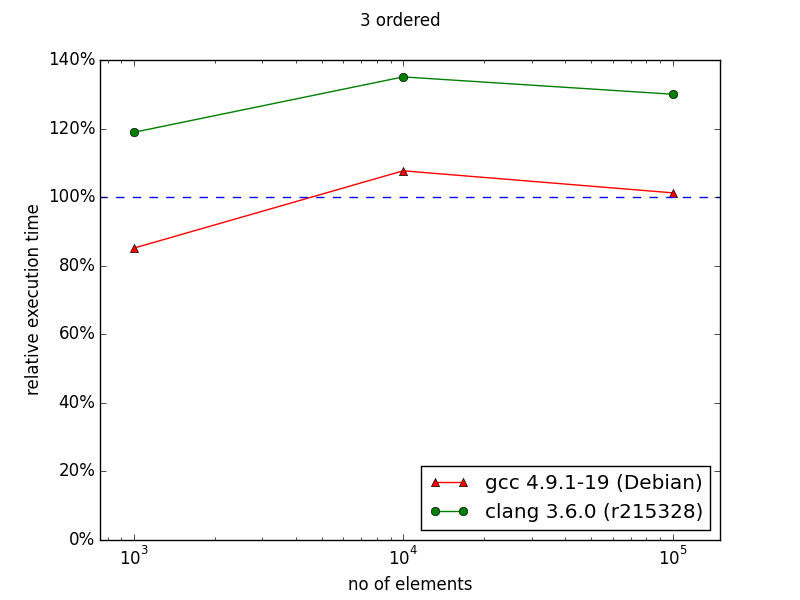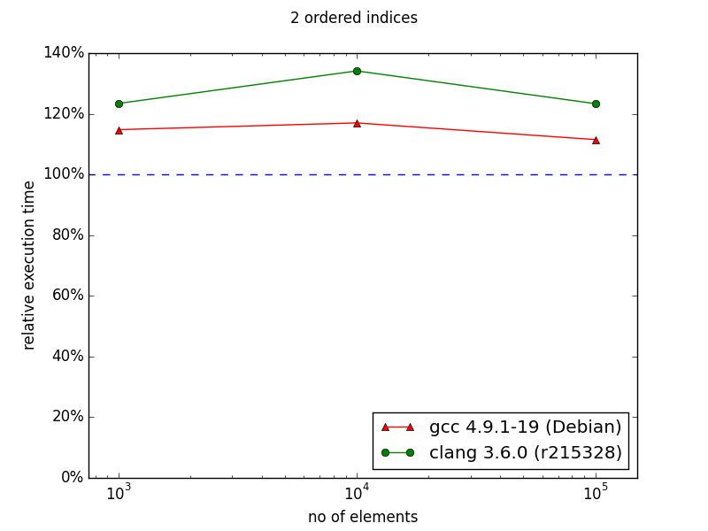 In the case of ordered index it's visible that either standard containers were improved or compilers learned how to optimize code using them better. Nevertheless, there is visible trend showing that with more than 106 entries, multi_index container could perform better than naive approach.