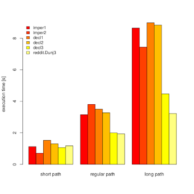 But what about performance? Which one will be faster - imperative or declarative approach? Intuition suggests that imperative version will win, but let's check.