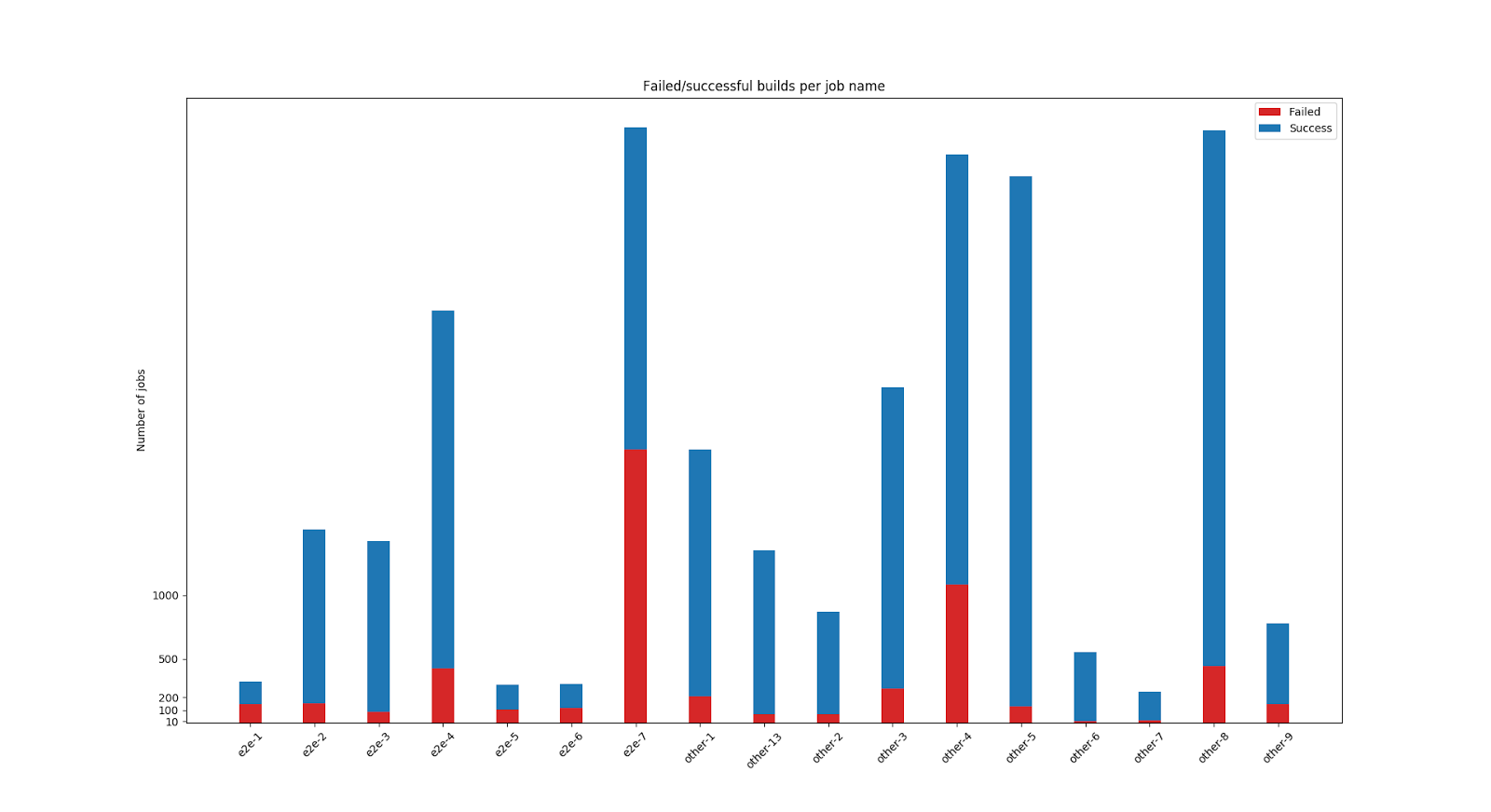 In other words, unstable environment was responsible for at least ~6.30% of observable failures. It might look like small number, but if you take into account that single job can last for 45 minutes, it becomes a lot of wasted time. Especially that failure notifications aren't always handled immediately. I also have a hunch that at some time people started to click "Retry" just to be sure the problem is not with the environment.